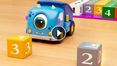 Маленькие машинки собирают пирамидку, а потом играют в тир и ведут счет с кубиками. Автобус Басси собирает пирамидку. Фиолетовое колечко, зеленое, желтое, красное. Ой, одного не хватает... С ним играет Экс, и не хочет его отдавать. Машинки, давайте не будем ссориться, а сыграем в тир. Кто наберет больше очков, получит колечко!